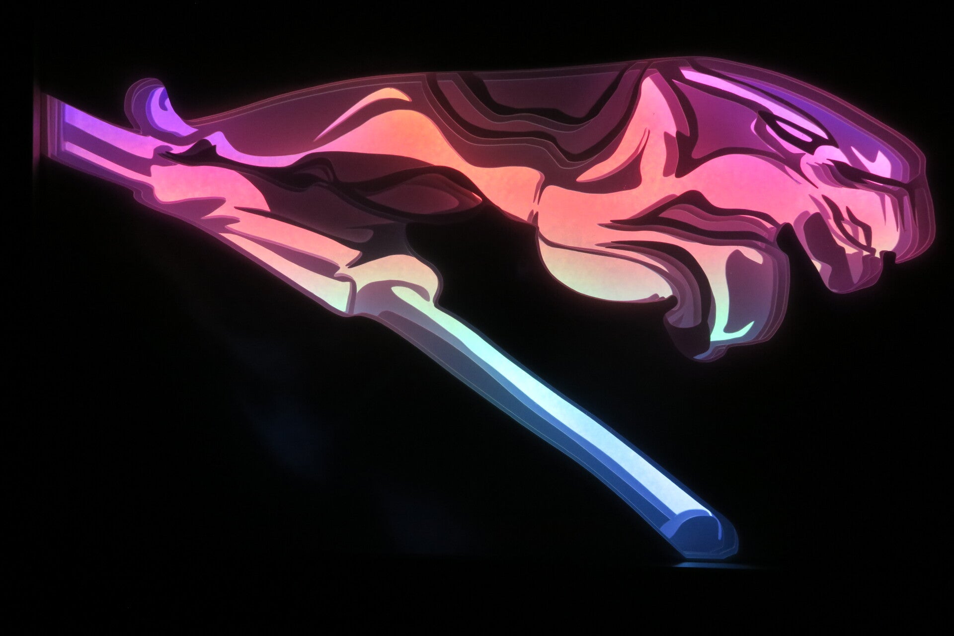 Dit is een kant en klare lichtbox van een leaper die soms op de motorkap van een Jaguar zit. De leaper zit in een liggende A4-lijst. Het licht werkt op netspanning.