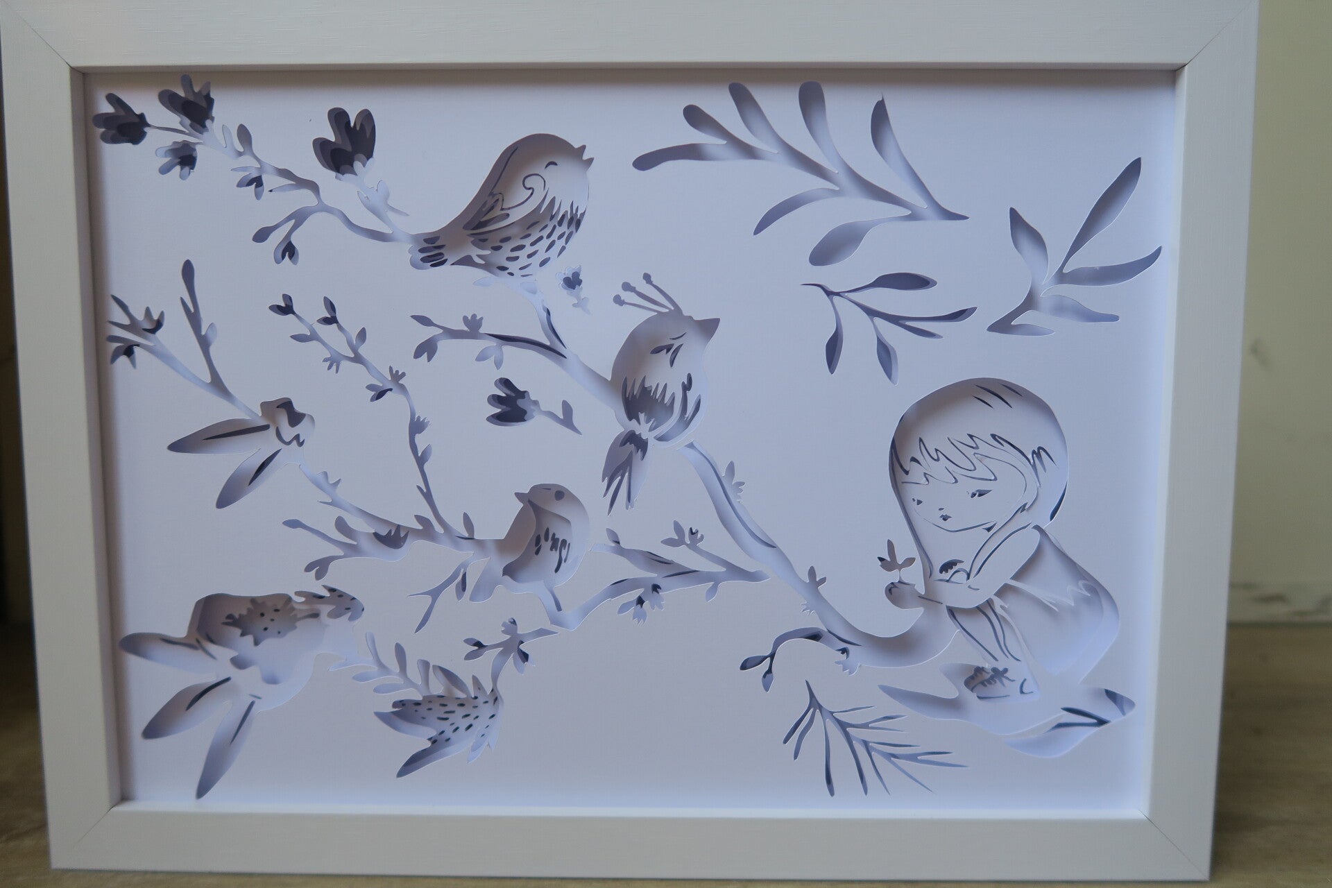 Dit is een kant en klare lichtbox van een meisje waarvan de haren takken zijn, met vogels. De voorstelling zit in een liggende A4-lijst. Het licht werkt op netspanning.